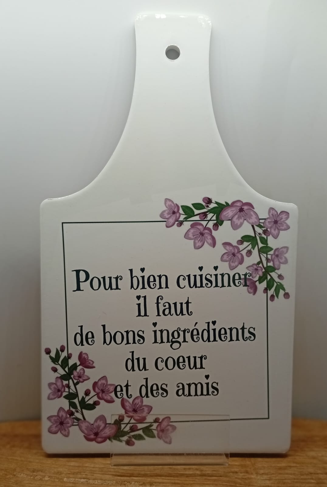 Dessous de plat en céramique personnalisé, sublimé par un motif fleuri et coloré et la phrase inspirante : « Pour bien cuisiner il faut de bons ingrédients, du coeur et des amis ». À la fois décoratif et fonctionnel, il protège vos surfaces tout en apportant une touche de poésie et de positivité à votre intérieur. Un bel objet du quotidien, idéal comme idée cadeau.