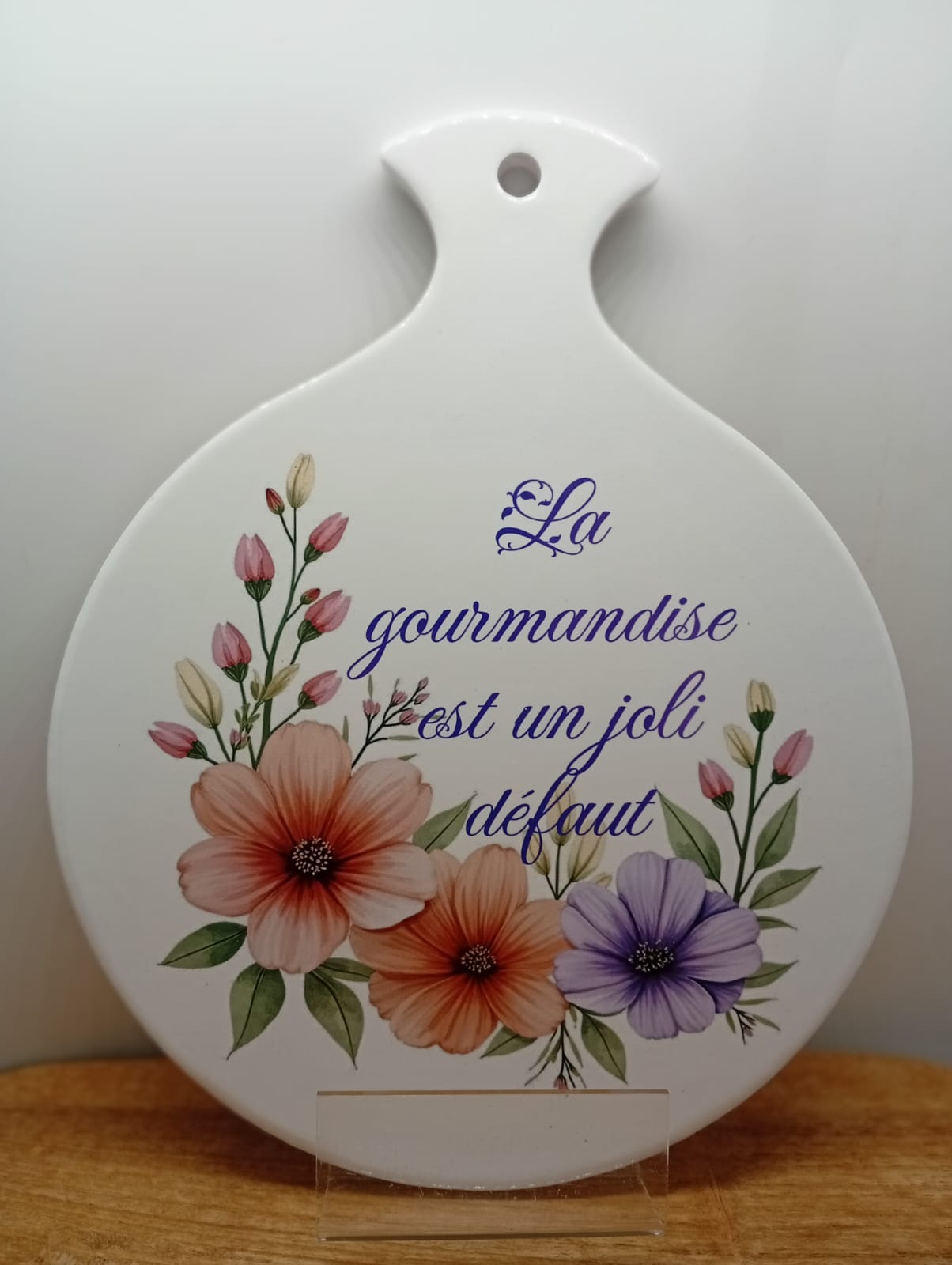Dessous de plat en céramique personnalisé, sublimé par un motif fleuri et coloré et la phrase inspirante : « La gourmandise est un joli défaut ». À la fois décoratif et fonctionnel, il protège vos surfaces tout en apportant une touche de poésie et de positivité à votre intérieur. Un bel objet du quotidien, idéal comme idée cadeau.