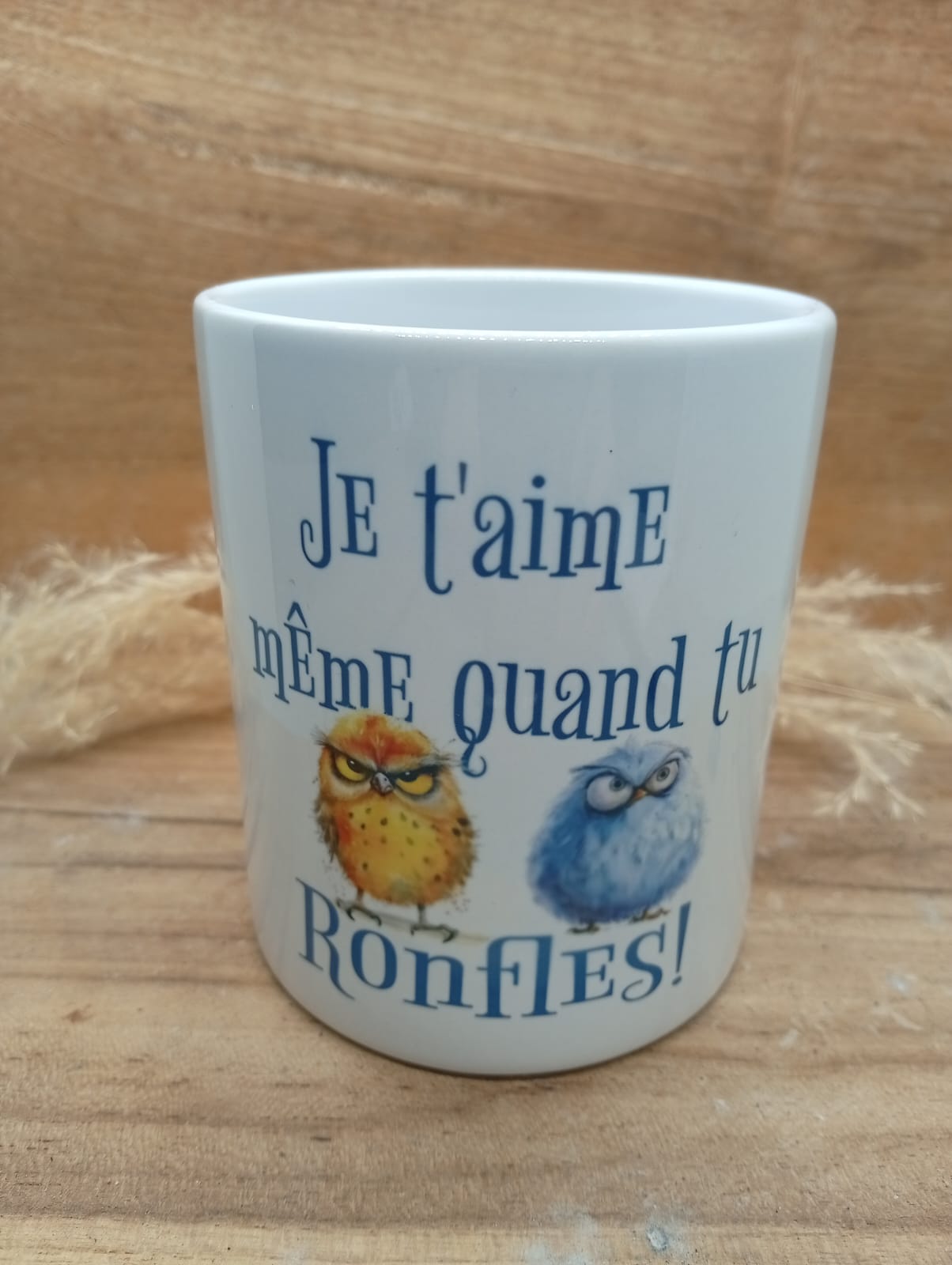 Mug personnalisé au design fleuri et coloré, sublimé par la phrase inspirante : « Je t’aime même quand tu ronfles». Un objet du quotidien à la fois esthétique et motivant, idéal pour apporter une touche de douceur et de positivité à chaque pause café ou thé. Parfait comme cadeau ou pour se faire plaisir.