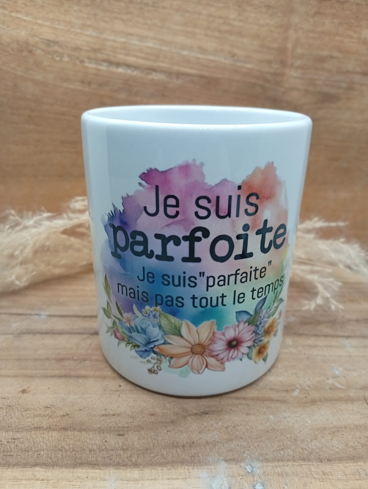 Mug personnalisé au design fleuri et coloré, sublimé par la phrase inspirante : « Parfoite ». Un objet du quotidien à la fois esthétique et motivant, idéal pour apporter une touche de douceur et de positivité à chaque pause café ou thé. Parfait comme cadeau ou pour se faire plaisir.