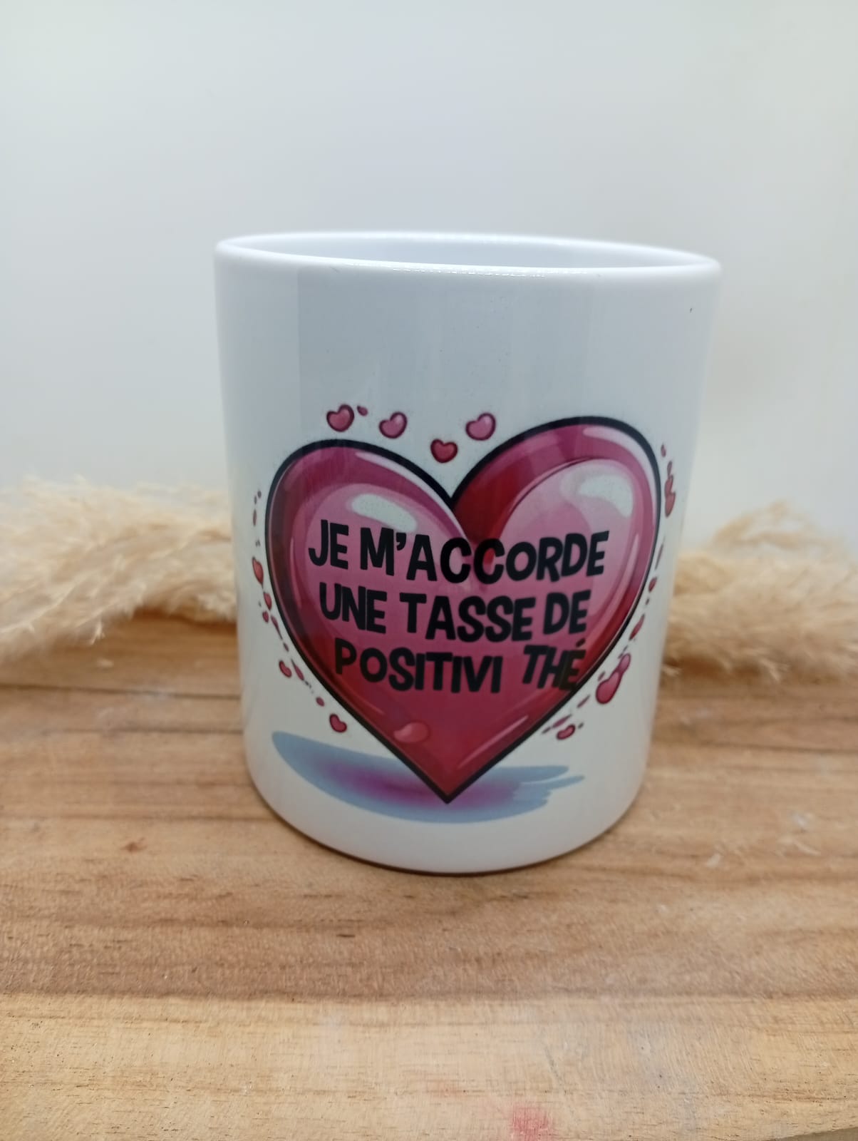 Mug personnalisé au design fleuri et coloré, sublimé par la phrase inspirante : « Je m’accorde une tasse de positivi Thé ». Un objet du quotidien à la fois esthétique et motivant, idéal pour apporter une touche de douceur et de positivité à chaque pause café ou thé. Parfait comme cadeau ou pour se faire plaisir.
