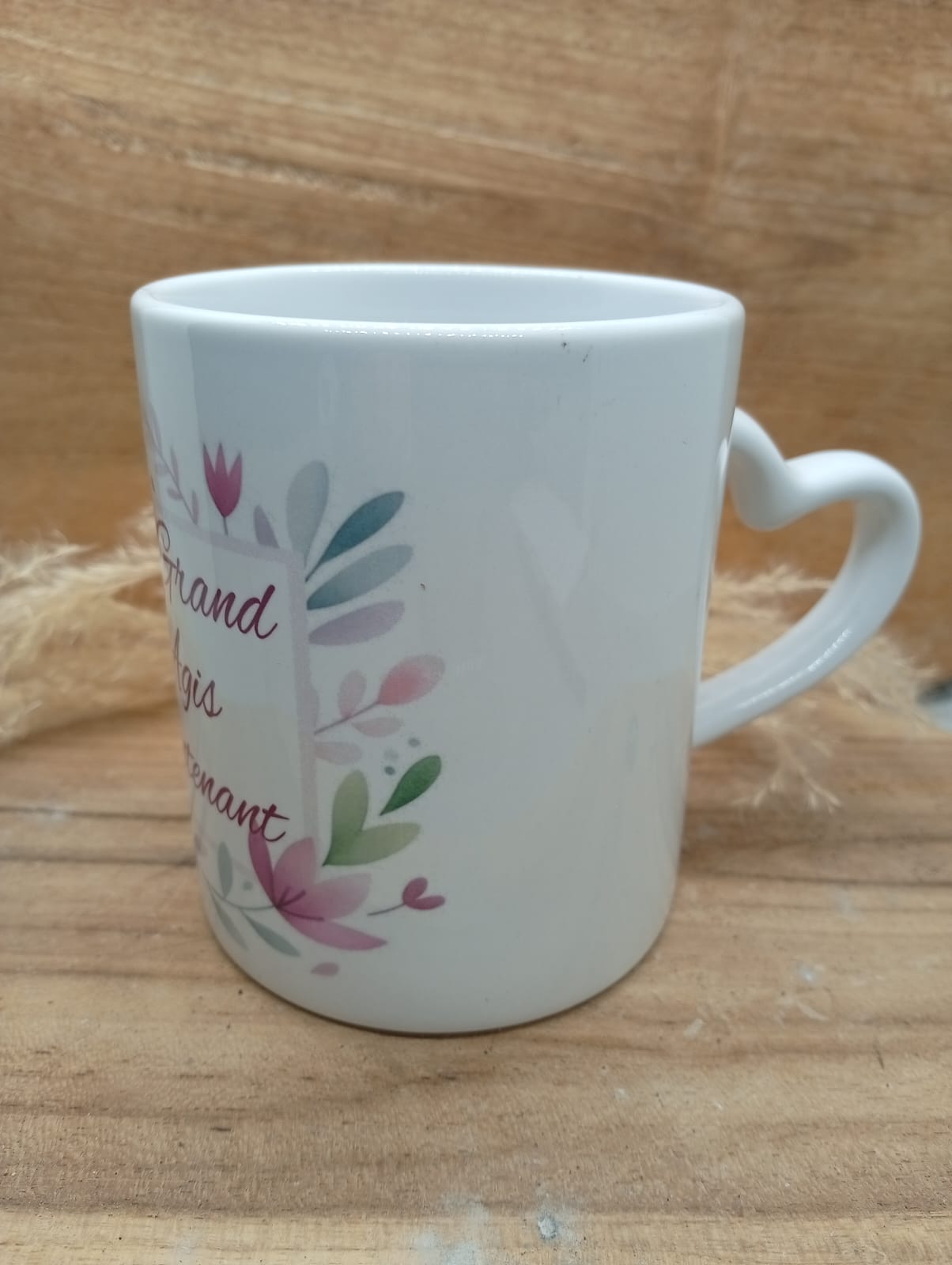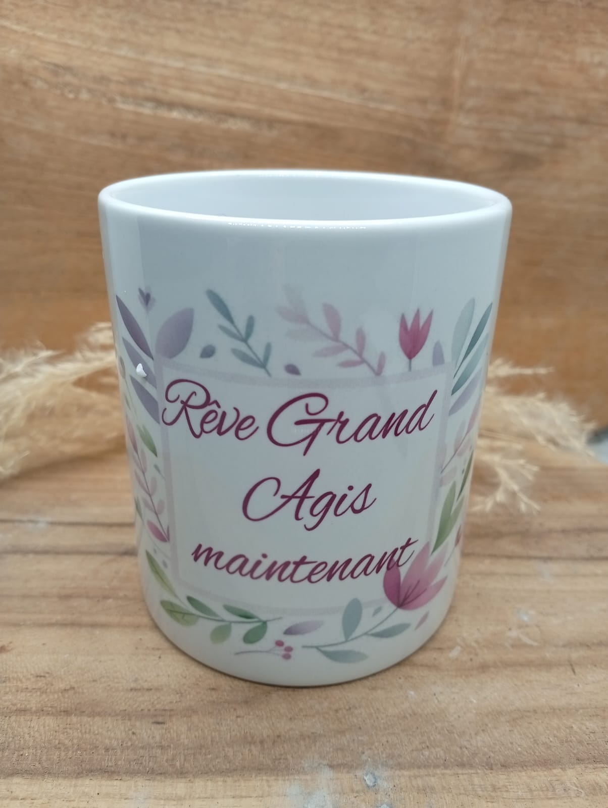 Mug personnalisé au design fleuri et coloré, sublimé par la phrase inspirante : « Rêve grand ». Un objet du quotidien à la fois esthétique et motivant, idéal pour apporter une touche de douceur et de positivité à chaque pause café ou thé. Parfait comme cadeau ou pour se faire plaisir.