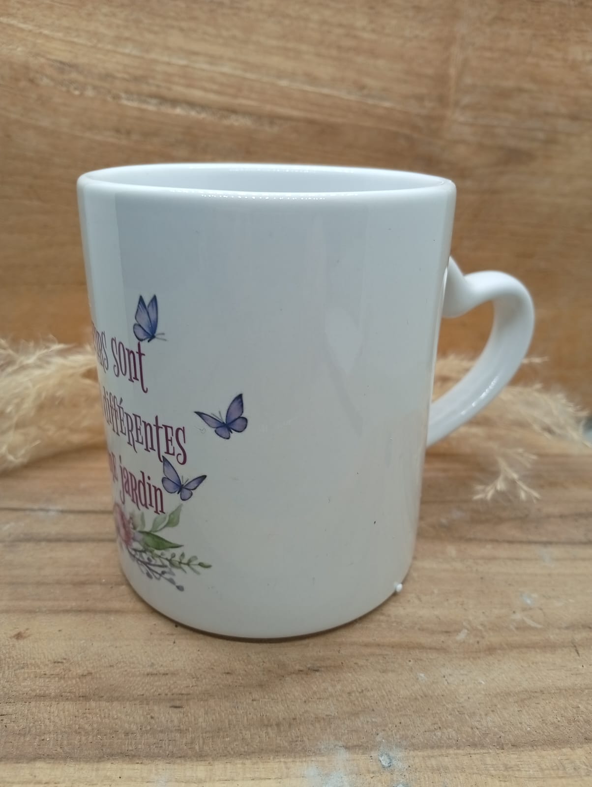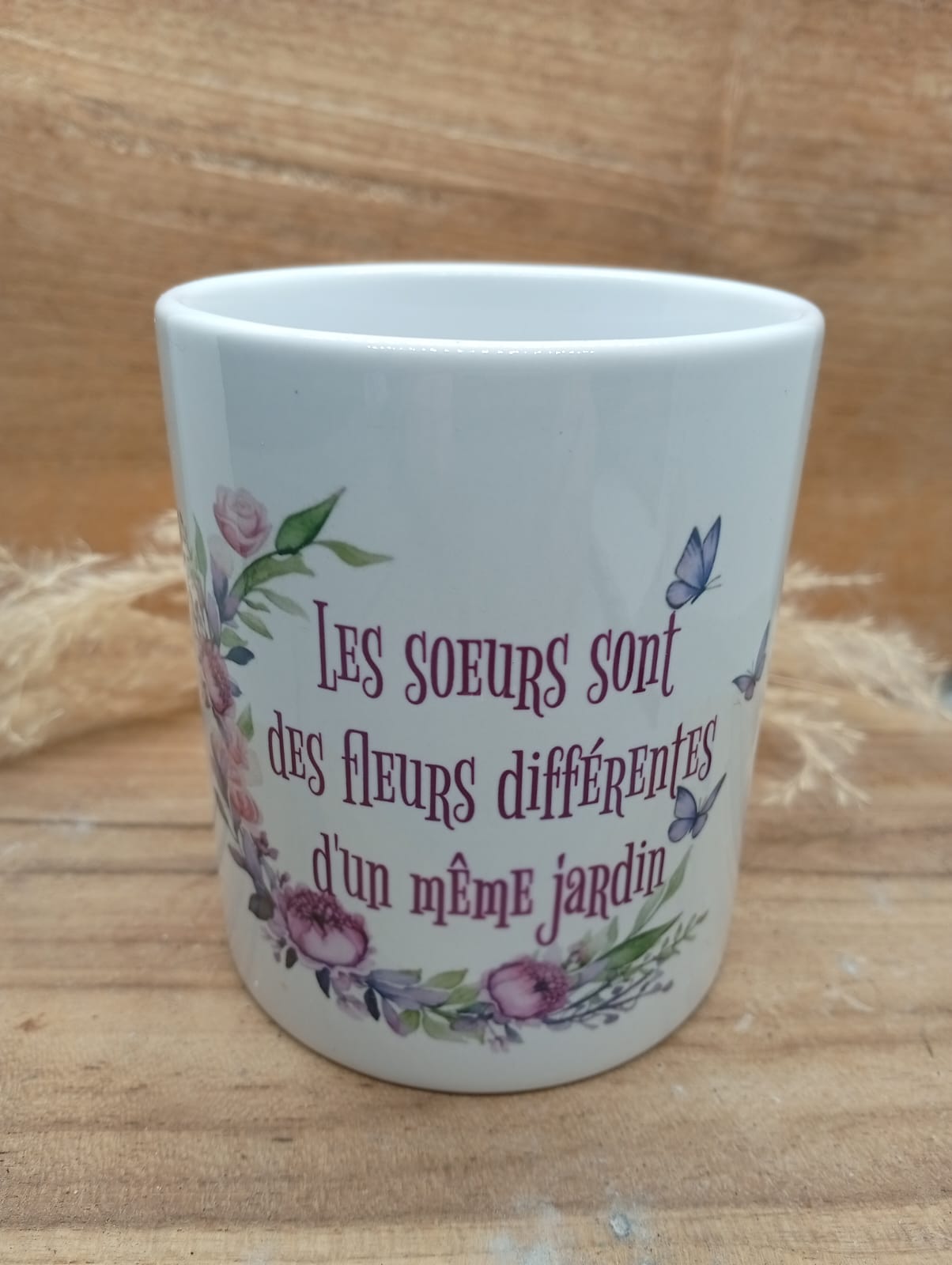 Mug personnalisé au design fleuri et coloré, sublimé par la phrase inspirante : « Les soeurs sont des fleurs différentes d’un même jardin ». Un objet du quotidien à la fois esthétique et motivant, idéal pour apporter une touche de douceur et de positivité à chaque pause café ou thé. Parfait comme cadeau ou pour se faire plaisir.