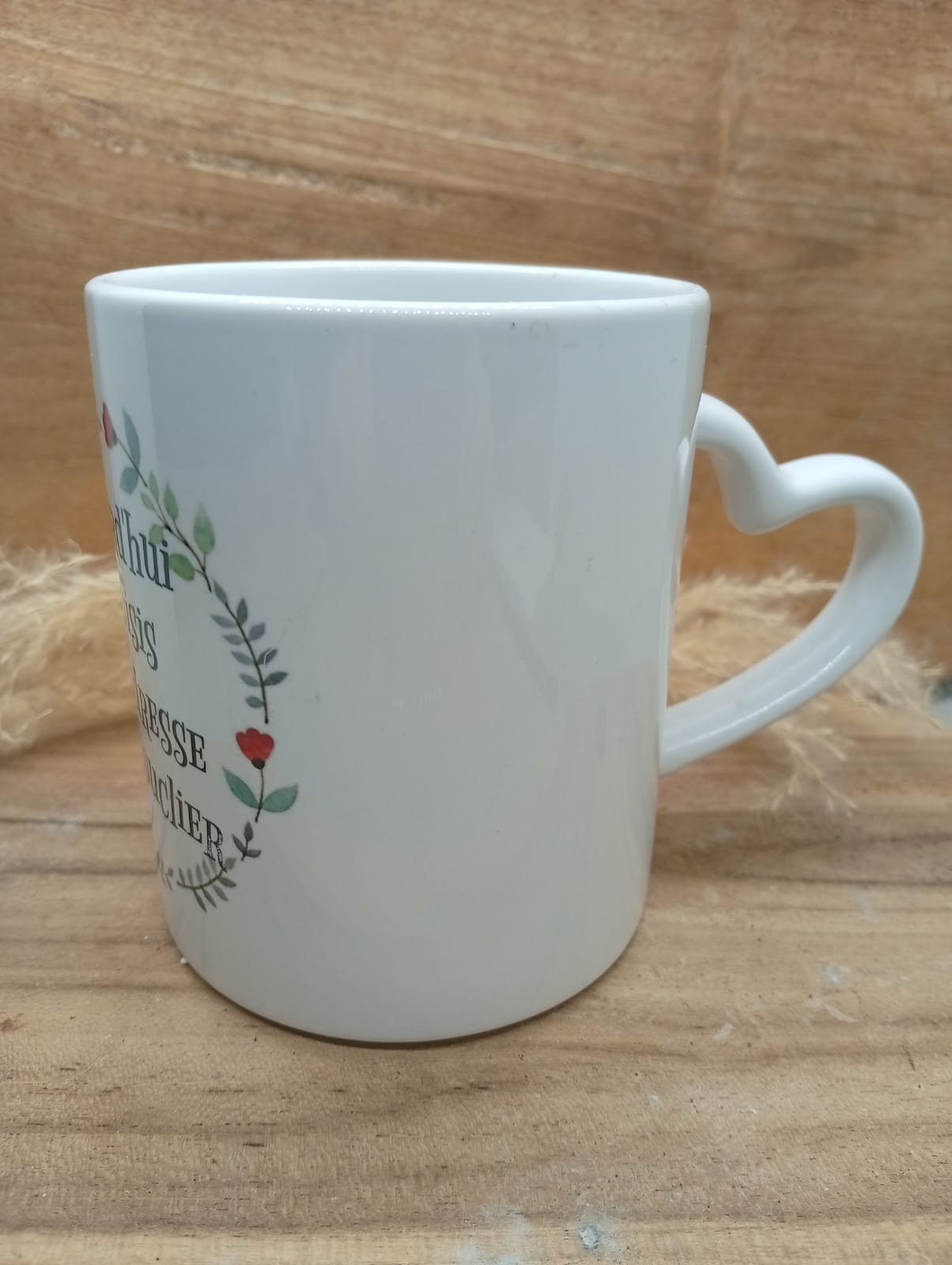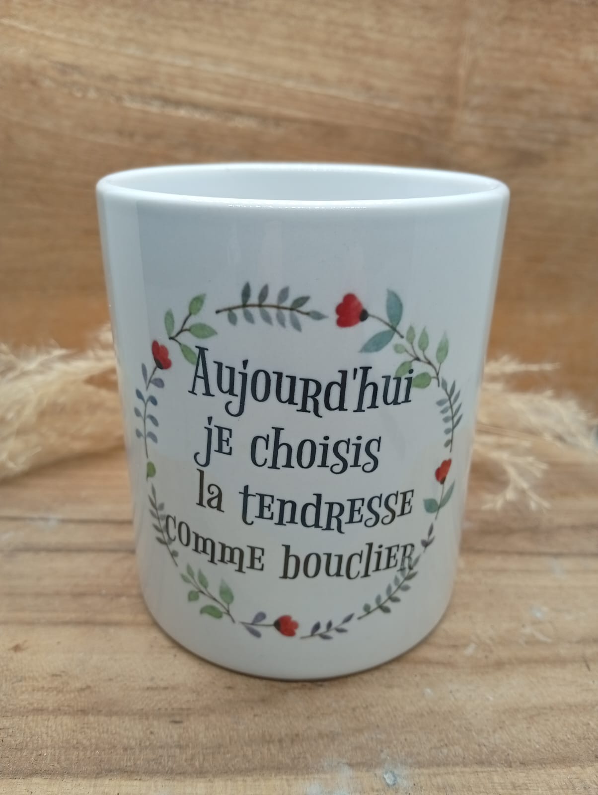 Mug personnalisé au design fleuri et coloré, sublimé par la phrase inspirante : « Aujourd’hui je choisis la tendresse comme bouclier ». Un objet du quotidien à la fois esthétique et motivant, idéal pour apporter une touche de douceur et de positivité à chaque pause café ou thé. Parfait comme cadeau ou pour se faire plaisir.