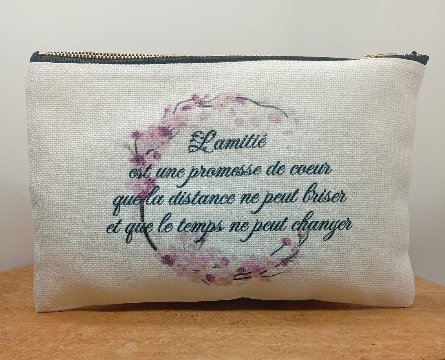Petite pochette personnalisée en tissu, ornée d’un motif fleuri et coloré, accompagnée de la phrase inspirante : « L’amitié est une promesse de coeur que la distance ne peut briser et que le temps ne peut changer ». À la fois pratique et élégante, elle est idéale pour ranger maquillage, accessoires ou petits essentiels du quotidien, tout en apportant une note de poésie et de positivité. Parfaite à offrir ou à s’offrir.