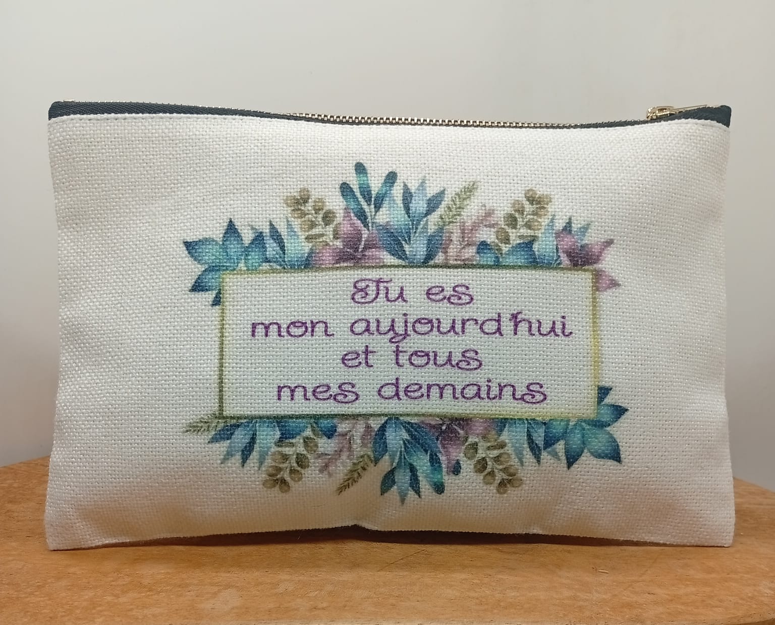 Petite pochette personnalisée en tissu, ornée d’un motif fleuri et coloré, accompagnée de la phrase inspirante : « Tu es mon aujourd’hui et tous mes demains ». À la fois pratique et élégante, elle est idéale pour ranger maquillage, accessoires ou petits essentiels du quotidien, tout en apportant une note de poésie et de positivité. Parfaite à offrir ou à s’offrir.