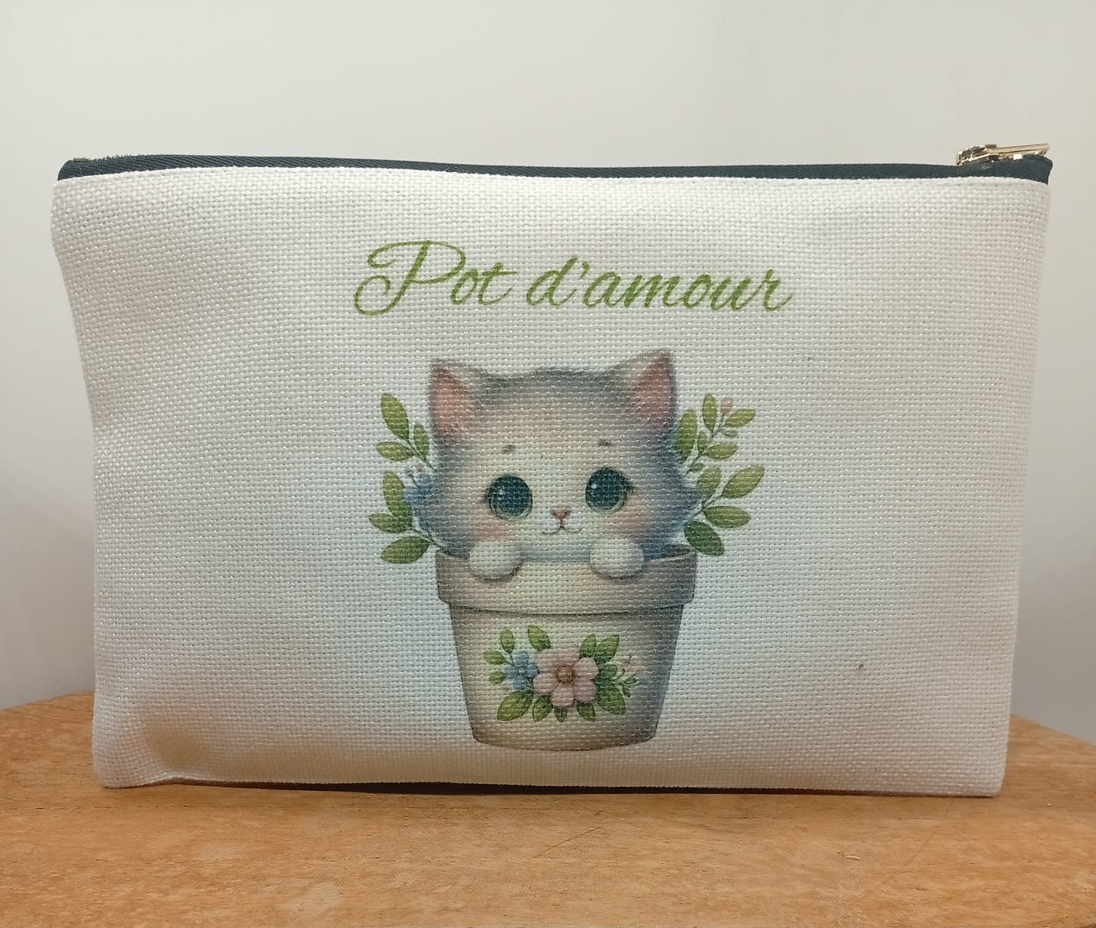 Petite pochette personnalisée en tissu, ornée d’un motif fleuri et coloré, accompagnée de la phrase inspirante : « Pot d’amour ». À la fois pratique et élégante, elle est idéale pour ranger maquillage, accessoires ou petits essentiels du quotidien, tout en apportant une note de poésie et de positivité. Parfaite à offrir ou à s’offrir.