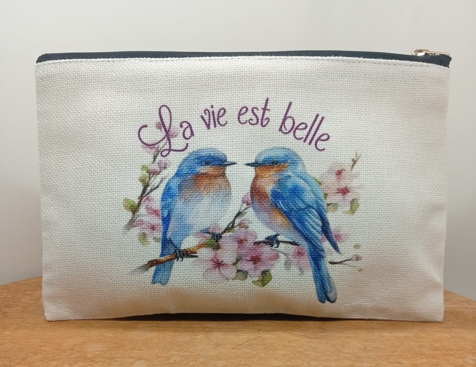 Petite pochette personnalisée en tissu, ornée d’un motif fleuri et coloré, accompagnée de la phrase inspirante : « La vie est belle». À la fois pratique et élégante, elle est idéale pour ranger maquillage, accessoires ou petits essentiels du quotidien, tout en apportant une note de poésie et de positivité. Parfaite à offrir ou à s’offrir.