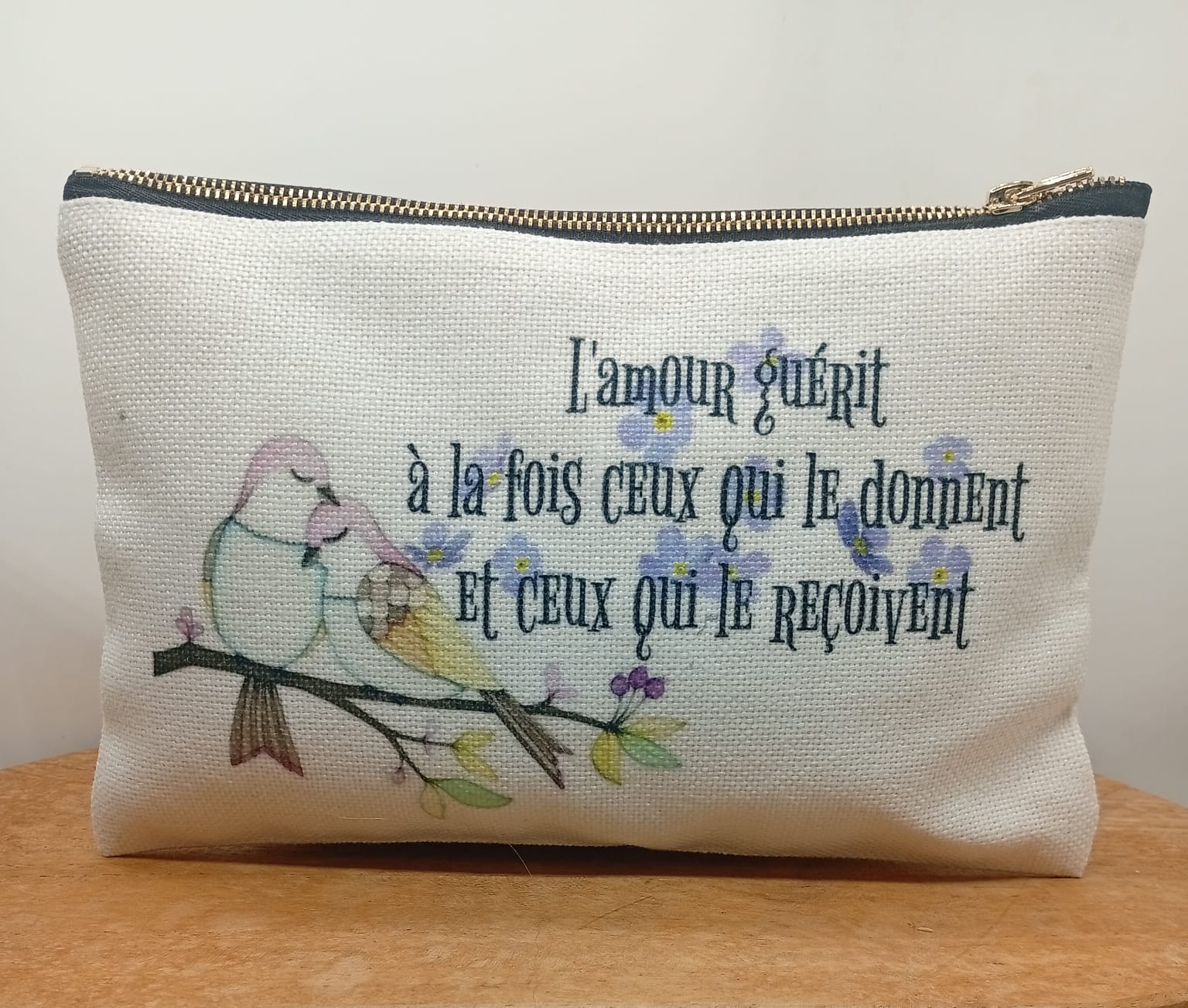 Petite pochette personnalisée en tissu, ornée d’un motif fleuri et coloré, accompagnée de la phrase inspirante : « L’amour guérit à la fois ceux qui le donnent et ceux qui le reçoivent ». À la fois pratique et élégante, elle est idéale pour ranger maquillage, accessoires ou petits essentiels du quotidien, tout en apportant une note de poésie et de positivité. Parfaite à offrir ou à s’offrir.