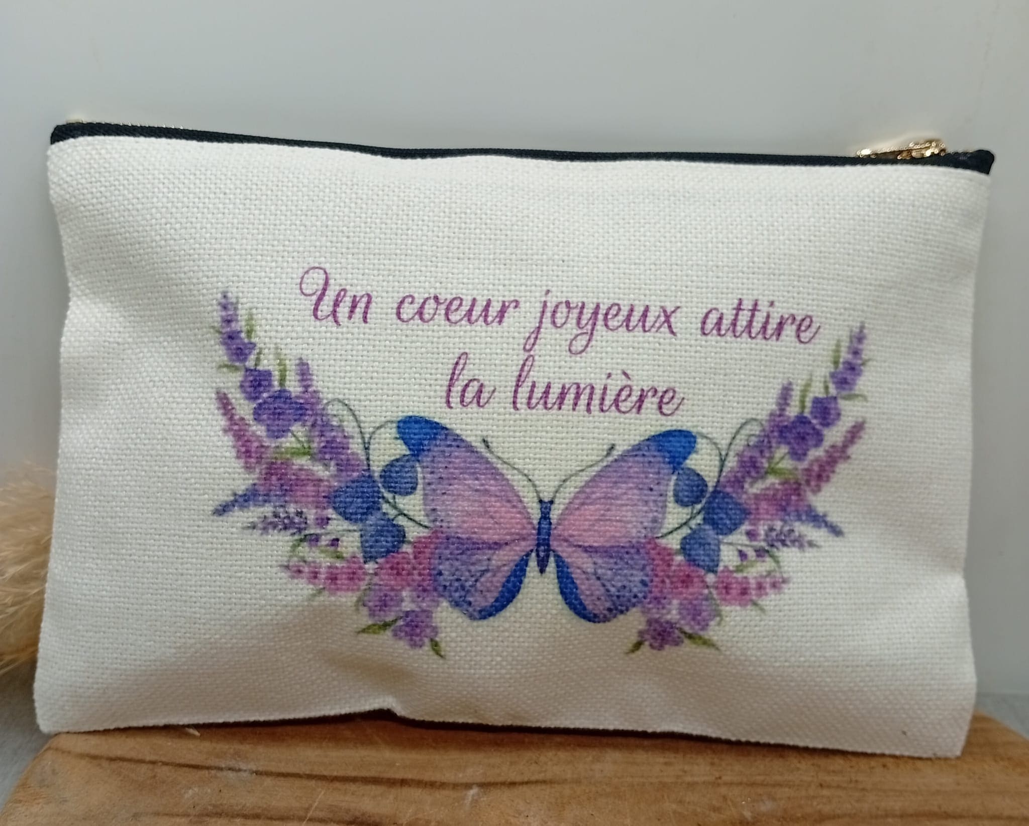Petite pochette personnalisée en tissu, ornée d’un motif fleuri et coloré, accompagnée de la phrase inspirante : « Un coeur joyeux attire la lumière ». À la fois pratique et élégante, elle est idéale pour ranger maquillage, accessoires ou petits essentiels du quotidien, tout en apportant une note de poésie et de positivité. Parfaite à offrir ou à s’offrir.