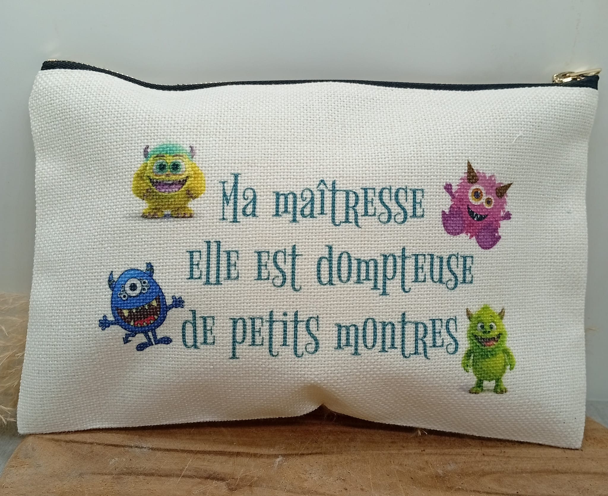 Petite pochette personnalisée en tissu, ornée d’un motif fleuri et coloré, accompagnée de la phrase inspirante : « Ma maîtresse est dompteuse de petits monstres ». À la fois pratique et élégante, elle est idéale pour ranger maquillage, accessoires ou petits essentiels du quotidien, tout en apportant une note de poésie et de positivité. Parfaite à offrir ou à s’offrir.