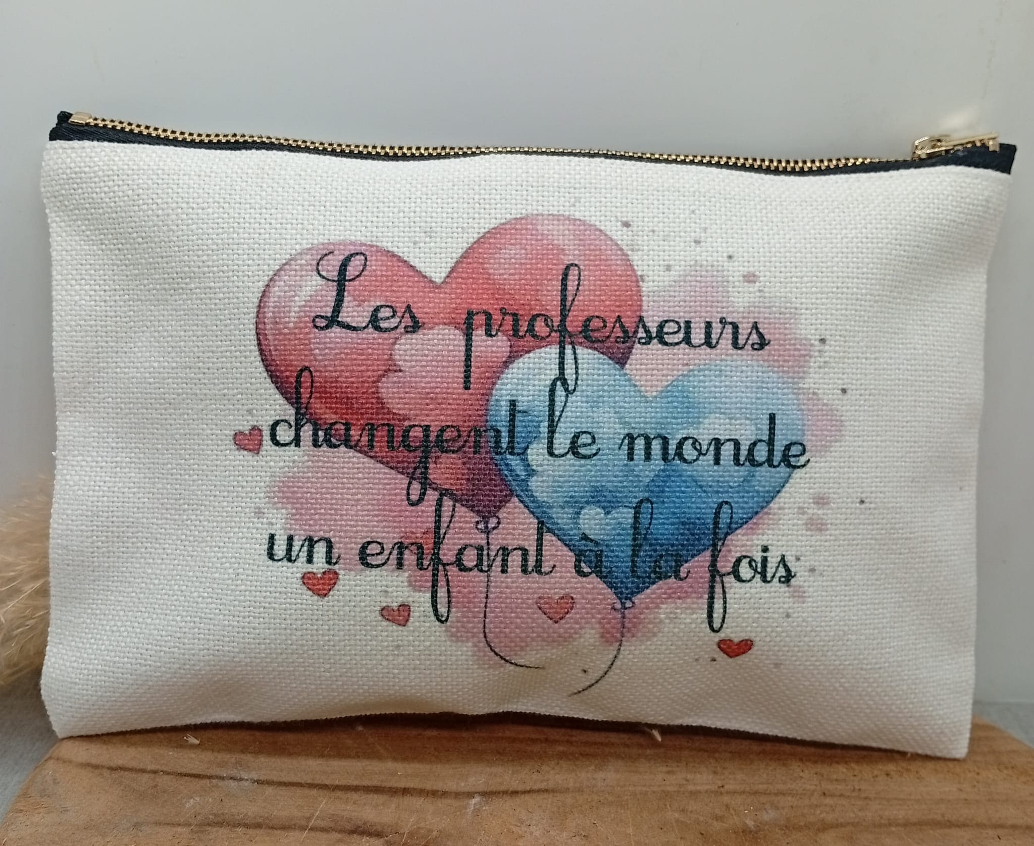 Petite pochette personnalisée en tissu, ornée d’un motif fleuri et coloré, accompagnée de la phrase inspirante : « Les professeurs changent le monde, un enfant à la fois ». À la fois pratique et élégante, elle est idéale pour ranger maquillage, accessoires ou petits essentiels du quotidien, tout en apportant une note de poésie et de positivité. Parfaite à offrir ou à s’offrir.