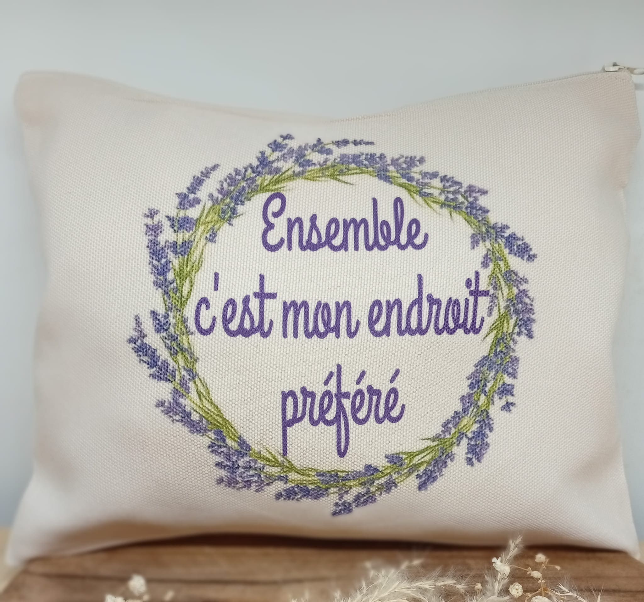 Pochette personnalisée en tissu, ornée d’un motif fleuri et coloré, accompagnée de la phrase inspirante : « Ensemble c’est mon endroit préféré ». À la fois pratique et élégante, elle est idéale pour ranger maquillage, accessoires ou petits essentiels du quotidien, tout en apportant une note de poésie et de positivité. Parfaite à offrir ou à s’offrir.