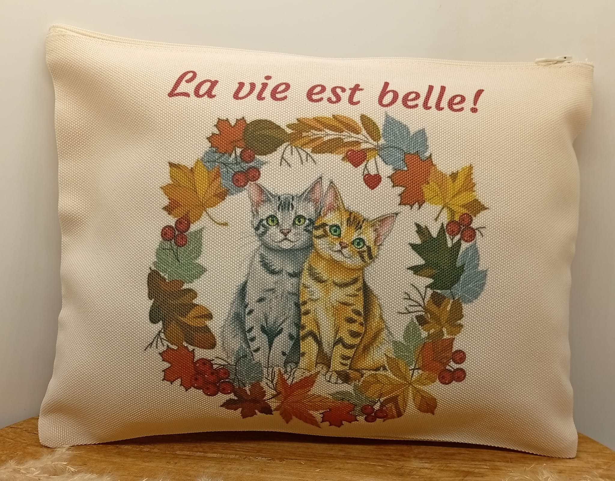 Pochette personnalisée en tissu, ornée d’un motif fleuri et coloré, accompagnée de la phrase inspirante : « La vie est belle ». À la fois pratique et élégante, elle est idéale pour ranger maquillage, accessoires ou petits essentiels du quotidien, tout en apportant une note de poésie et de positivité. Parfaite à offrir ou à s’offrir.