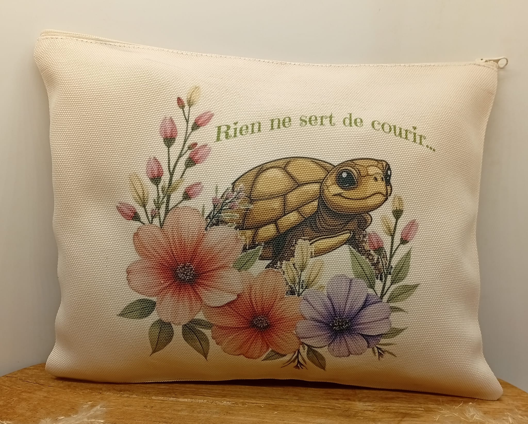 Pochette personnalisée en tissu, ornée d’un motif fleuri et coloré, accompagnée de la phrase inspirante : « Rien ne sert de courir… ». À la fois pratique et élégante, elle est idéale pour ranger maquillage, accessoires ou petits essentiels du quotidien, tout en apportant une note de poésie et de positivité. Parfaite à offrir ou à s’offrir.