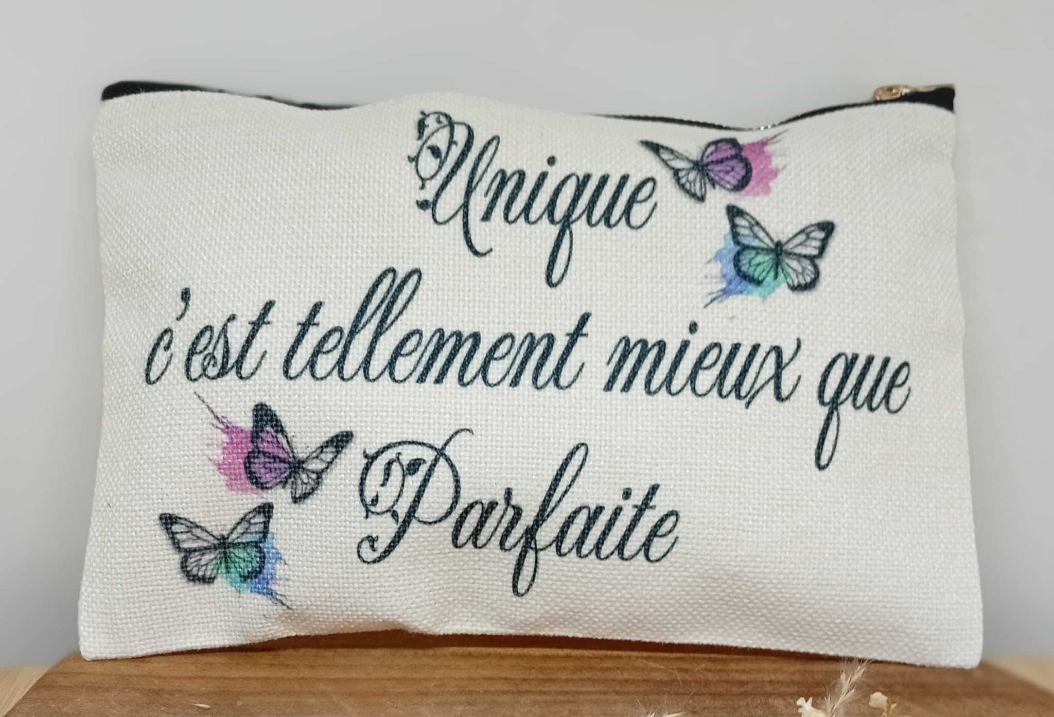Pochette personnalisée en tissu, ornée d’un motif fleuri et coloré, accompagnée de la phrase inspirante : « Unique c’est tellement mieux que parfaite ». À la fois pratique et élégante, elle est idéale pour ranger maquillage, accessoires ou petits essentiels du quotidien, tout en apportant une note de poésie et de positivité. Parfaite à offrir ou à s’offrir.