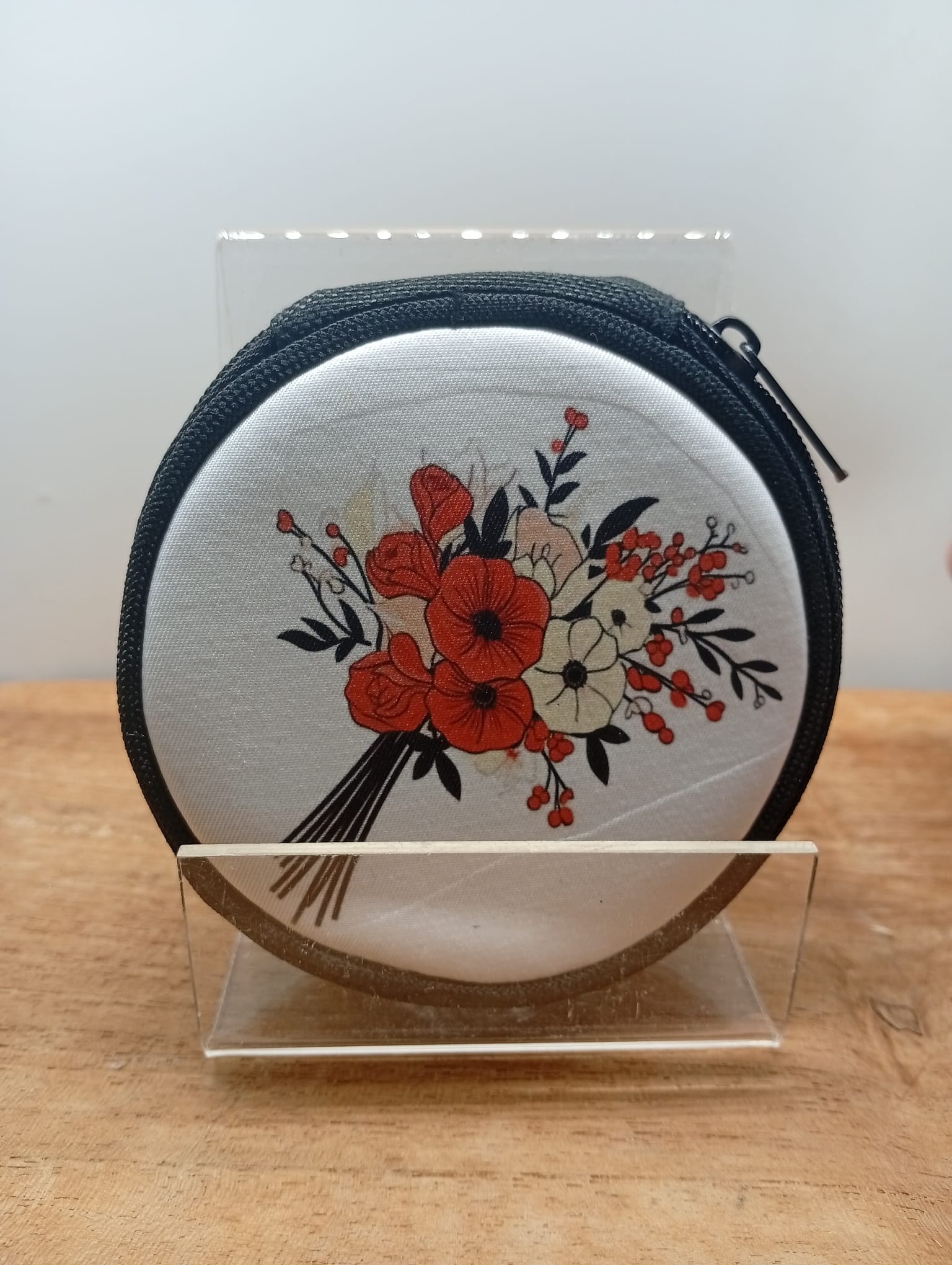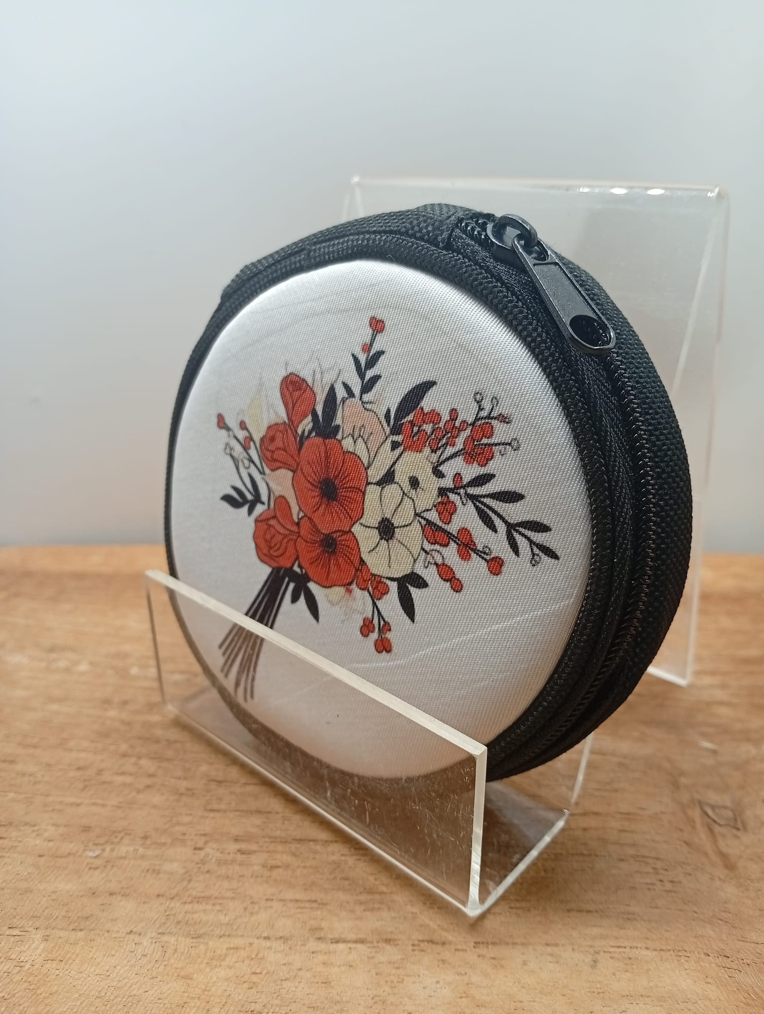 Petit porte-monnaie rond personnalisé, confectionné en tissu et décoré de motifs fleuris et colorés. Compact et pratique, il est idéal pour ranger monnaie ou petits indispensables, tout en diffusant un message positif et poétique au quotidien. Un accessoire charmant à offrir ou à s’offrir.