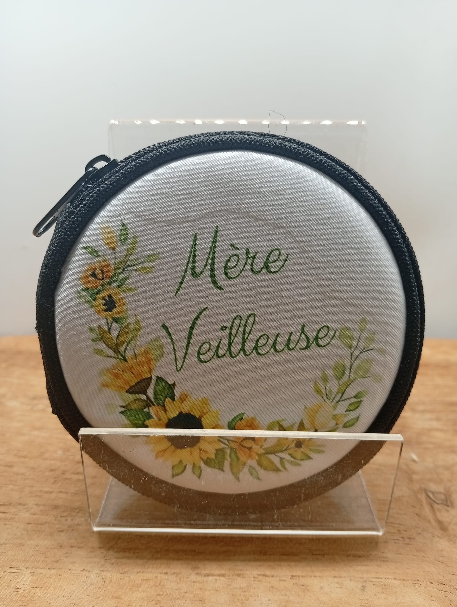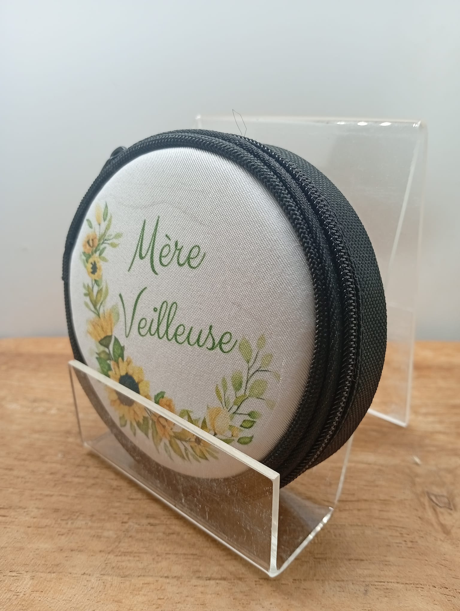 Petit porte-monnaie rond personnalisé, confectionné en tissu et décoré de motifs fleuris et colorés, accompagné de la phrase inspirante : « Mère-veilleuse ». Compact et pratique, il est idéal pour ranger monnaie ou petits indispensables, tout en diffusant un message positif et poétique au quotidien. Un accessoire charmant à offrir ou à s’offrir.