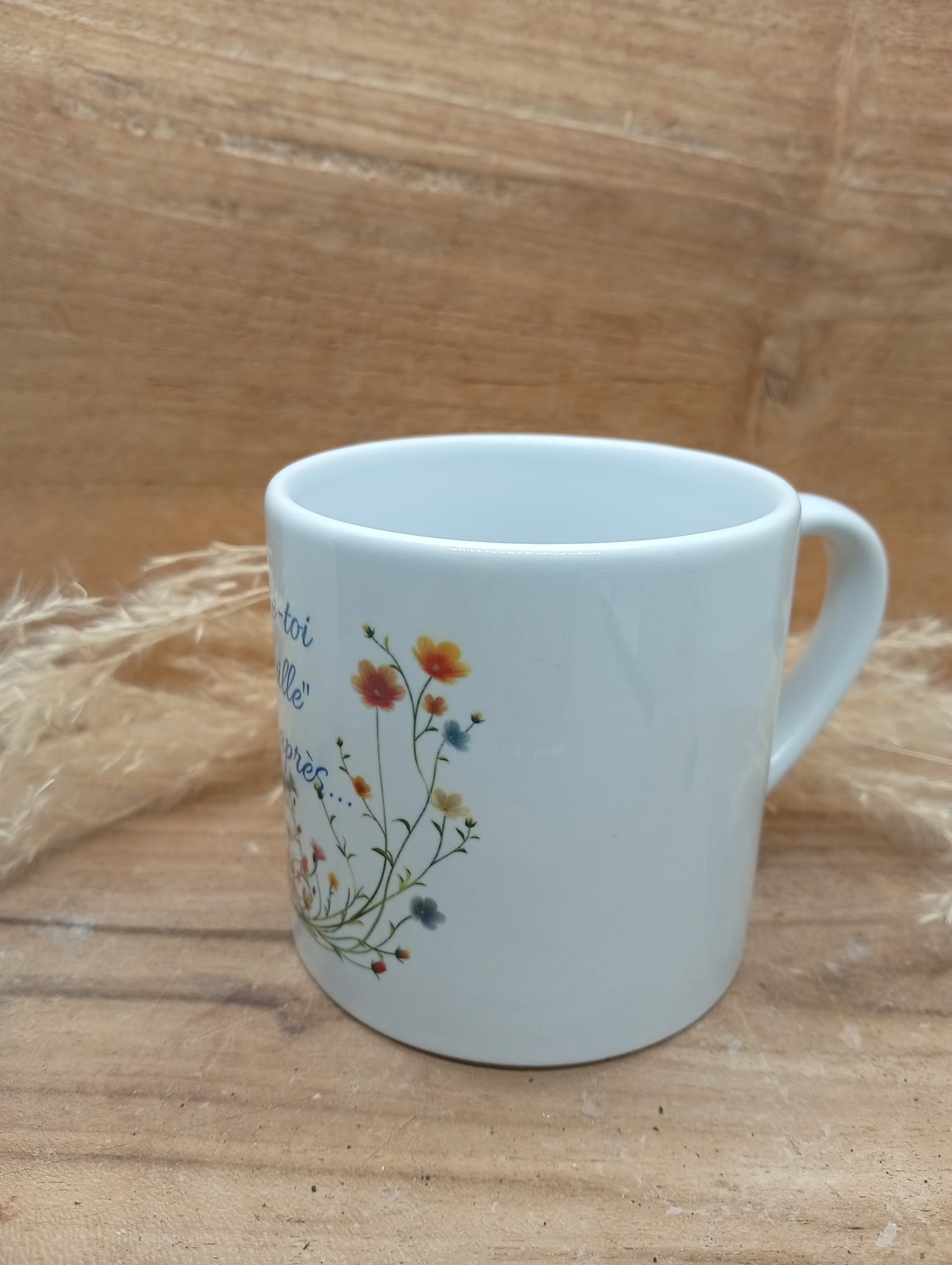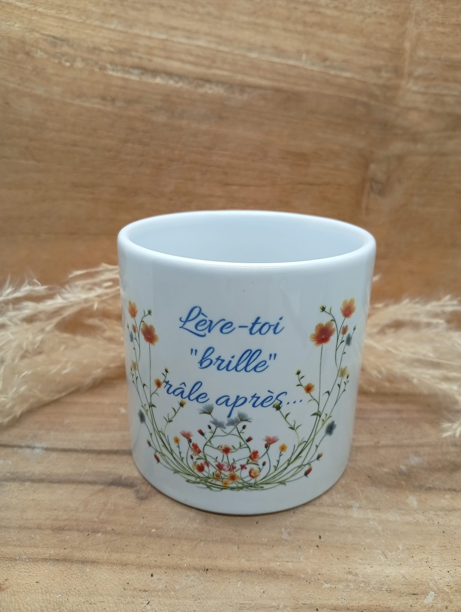 Tasse personnalisée au design fleuri et coloré, sublimée par la phrase inspirante : « Lève-toi, brille, râle après…». Un objet du quotidien à la fois esthétique et motivant, idéal pour apporter une touche de douceur et de positivité à chaque pause café ou thé. Parfait comme cadeau ou pour se faire plaisir.