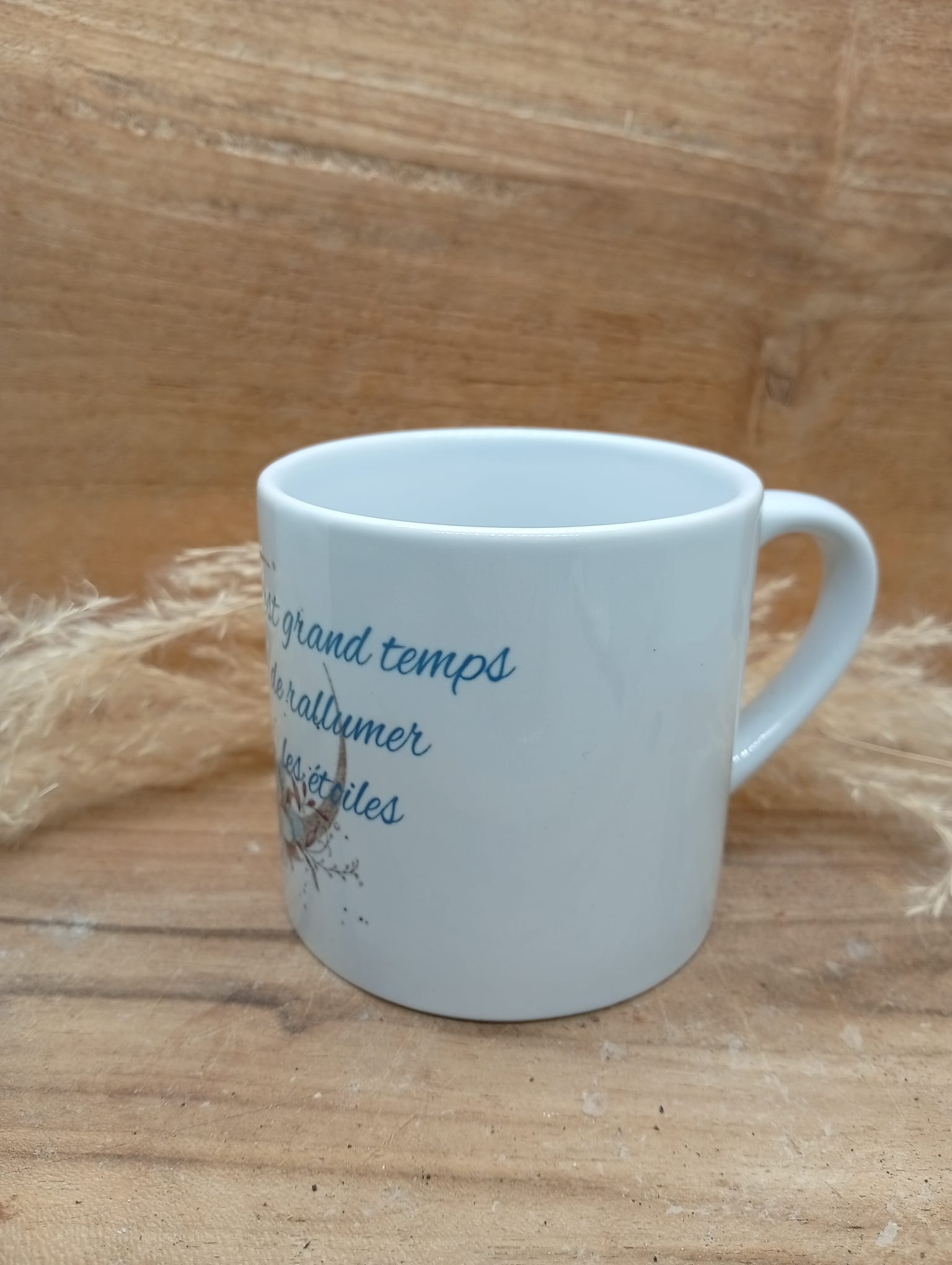 Tasse personnalisée au design fleuri et coloré, sublimée par la phrase inspirante : « Il est grand temps de rallumer les étoiles ». Un objet du quotidien à la fois esthétique et motivant, idéal pour apporter une touche de douceur et de positivité à chaque pause café ou thé. Parfait comme cadeau ou pour se faire plaisir.