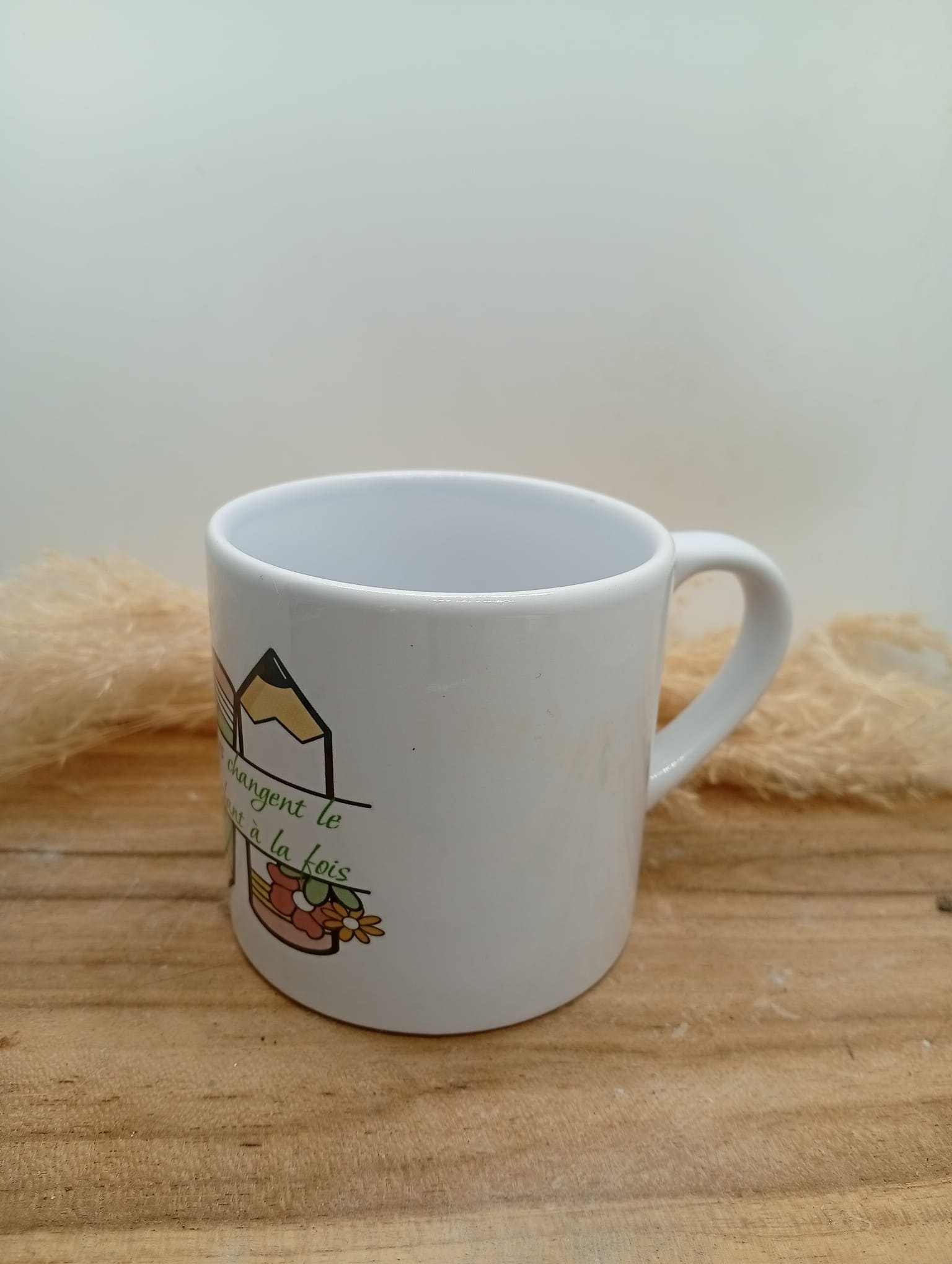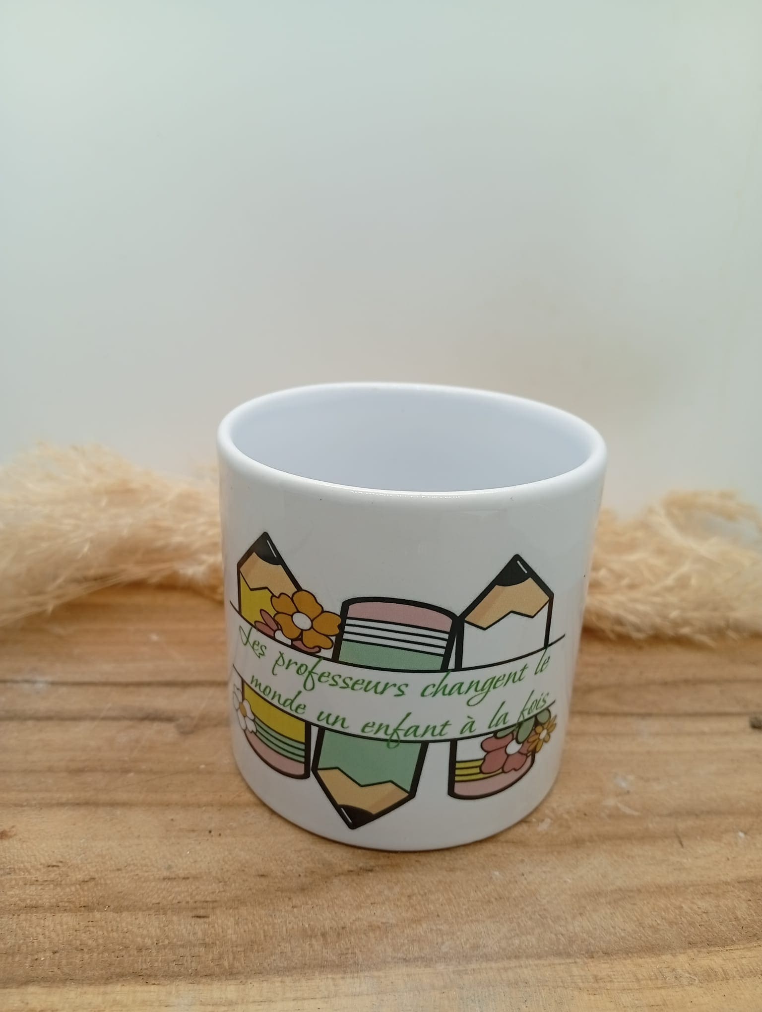 Tasse personnalisée au design fleuri et coloré, sublimée par la phrase inspirante : « Les professeurs changent le monde, un enfant à la fois ». Un objet du quotidien à la fois esthétique et motivant, idéal pour apporter une touche de douceur et de positivité à chaque pause café ou thé. Parfait comme cadeau ou pour se faire plaisir.