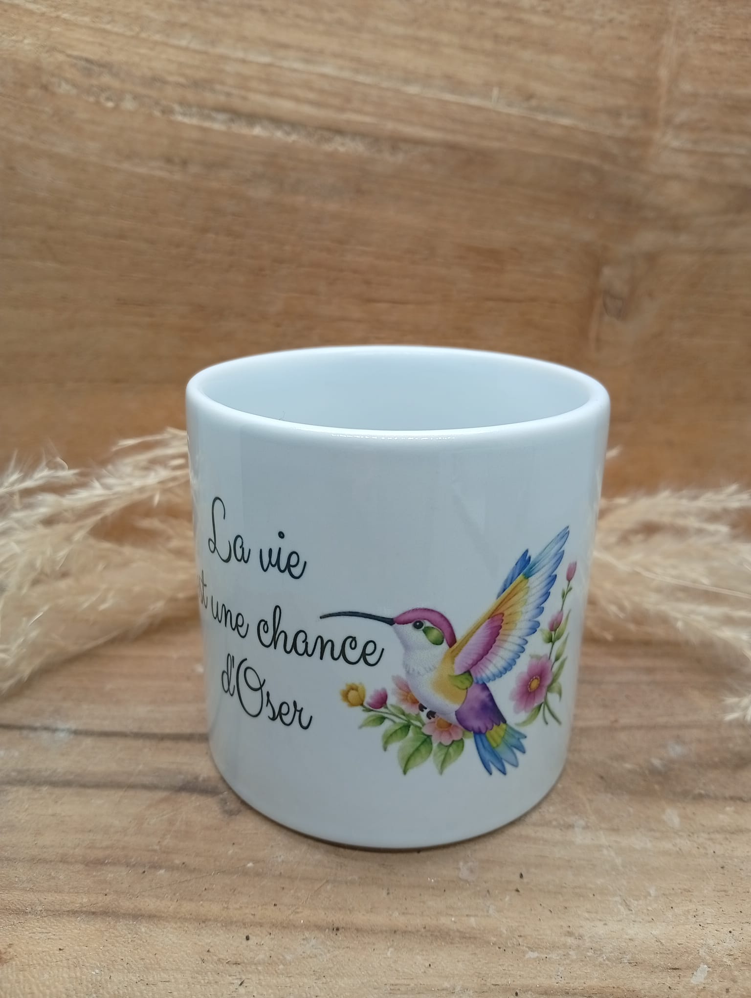 Tasse personnalisée au design fleuri et coloré, sublimée par la phrase inspirante : « La vie est une chance d’oser ». Un objet du quotidien à la fois esthétique et motivant, idéal pour apporter une touche de douceur et de positivité à chaque pause café ou thé. Parfait comme cadeau ou pour se faire plaisir.