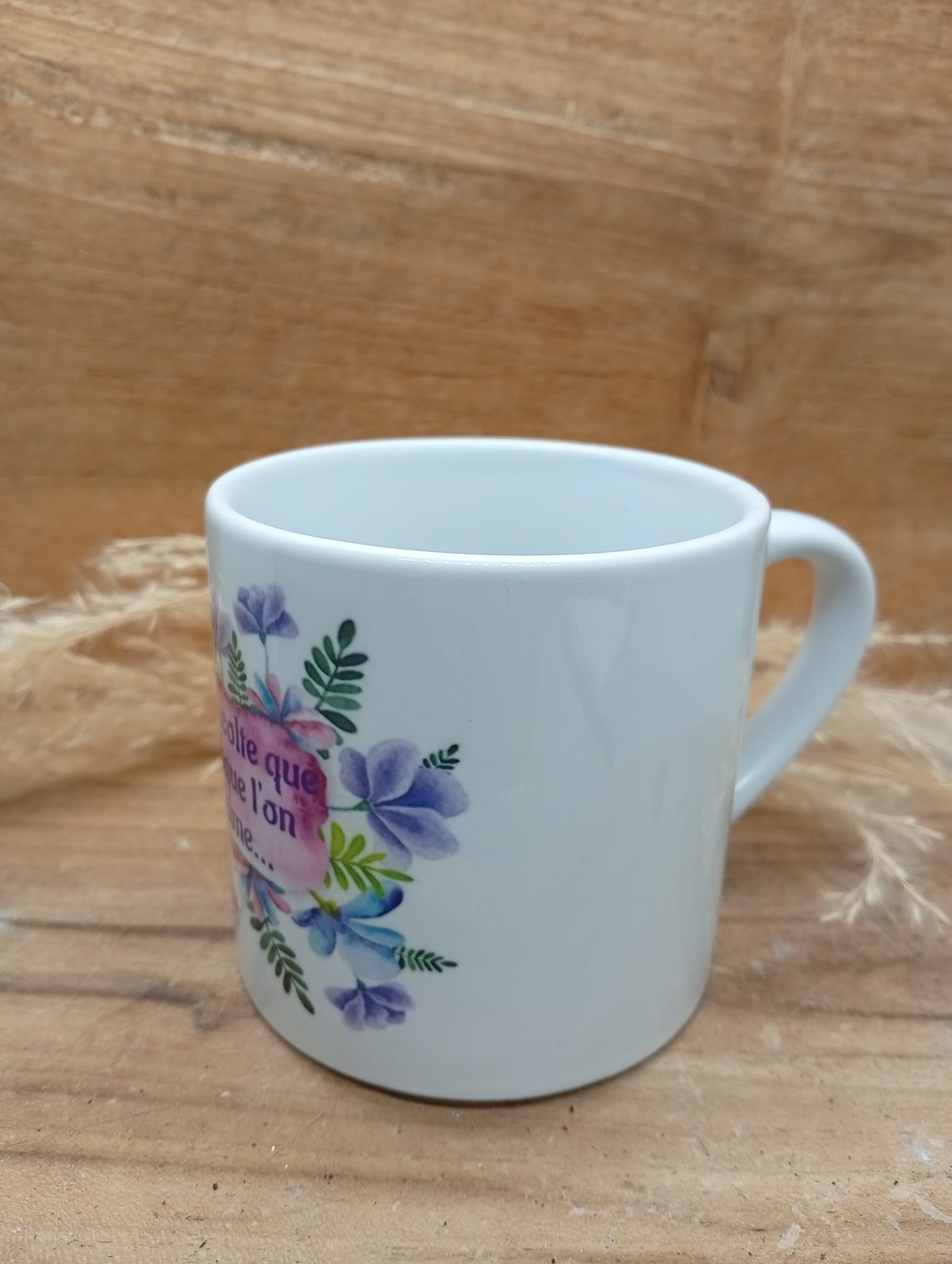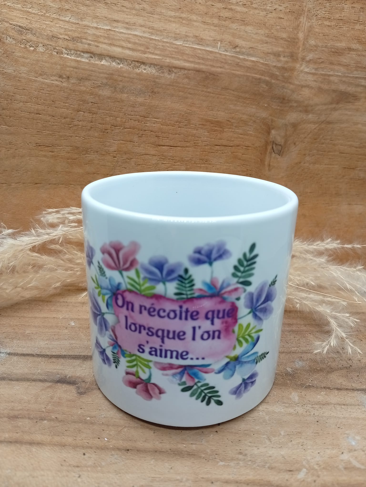 Tasse personnalisée au design fleuri et coloré, sublimée par la phrase inspirante : « On récolte que lorsque l’on s’aime ». Un objet du quotidien à la fois esthétique et motivant, idéal pour apporter une touche de douceur et de positivité à chaque pause café ou thé. Parfait comme cadeau ou pour se faire plaisir.